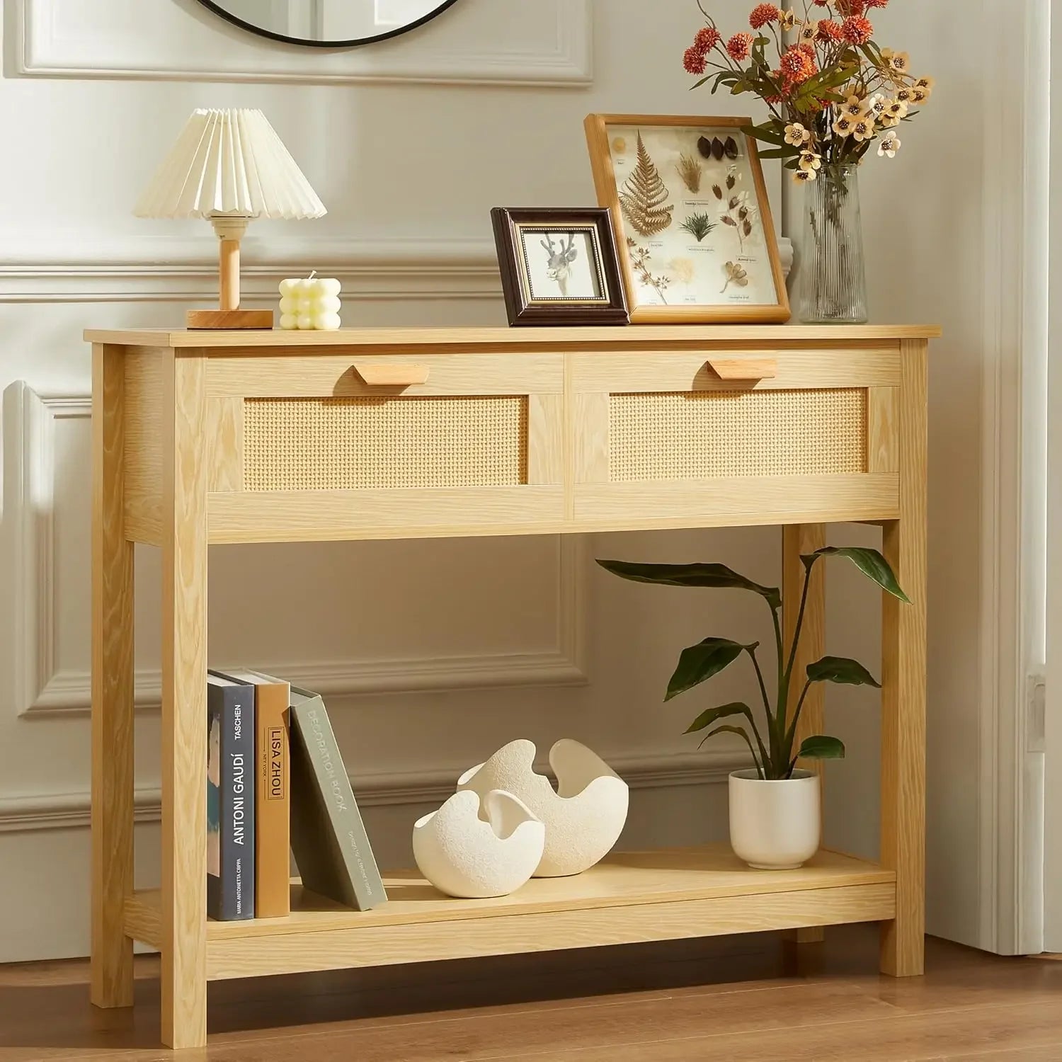 Elevate your entryway with a Boho-chic rattan console that blends natural texture with practical storage.
